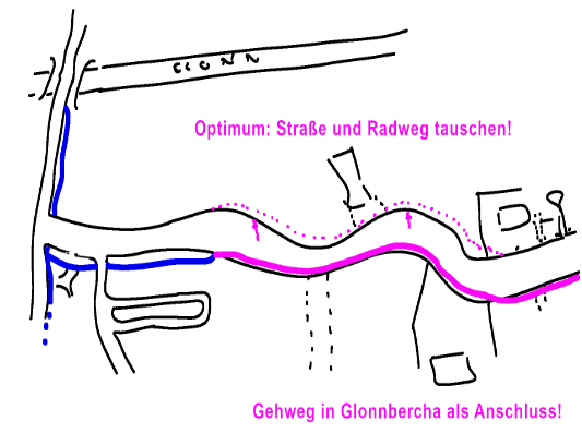 - Unserer Vorschlag (Skizze 3): Man könnte anstatt der neuen Trassierung bei gleichem Grundstücksbedarf Straße und Radweg austauschen: der Radweg verliefe dann korrekterweise auf der Südseite im Anschluß an den bereits verhandenen Abschnitt im Bereich der Wendelsteinsiedlung „Über der Glonn“. Die gesamte Trasse wäre praktisch schon fertig, da man einfach nur einen hierzu notwendigen Streifen der bestehenden Straße abtrennt und als Radweg verwendet. Die „neue“ Strasse selbst rückt dann ein wenig nach Norden hin zur Glonn – und fertig!