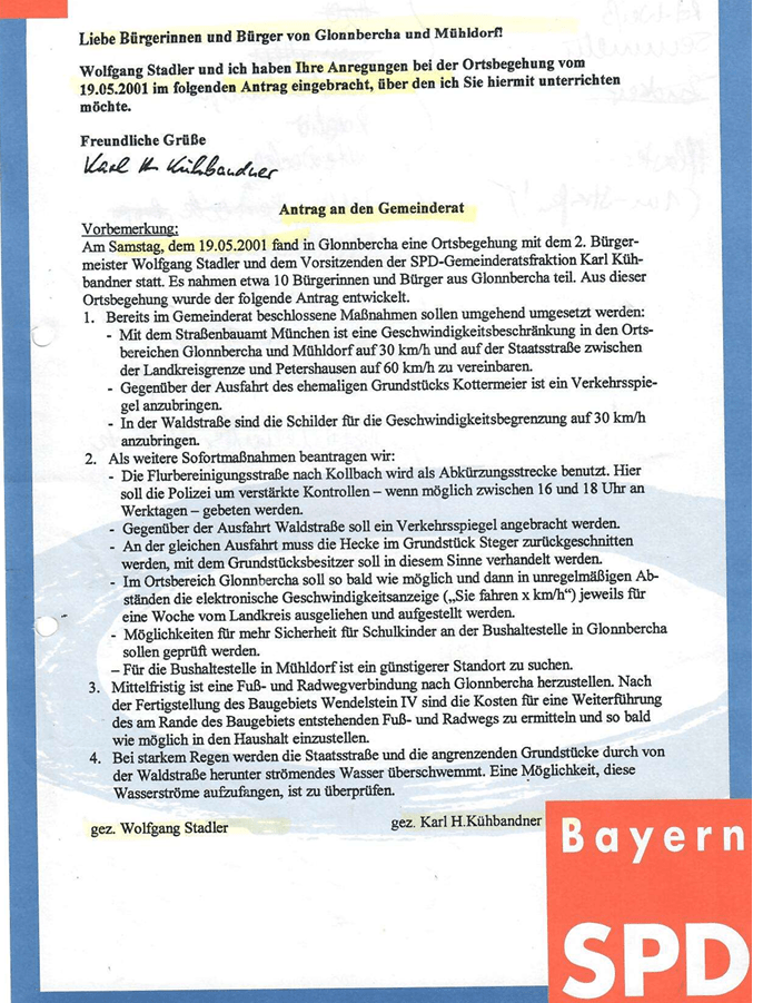 „Wann werden wir endlich einmal den seit Jahrzehnten versprochenen und dringend notwendigen Geh- und Radweg von Glonnbercha nach Petershausen und
