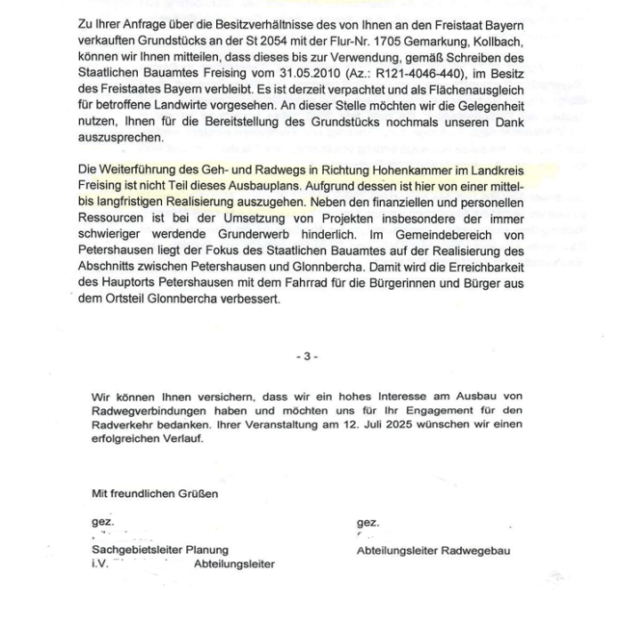 Bevölkerung sehr im Wachsen ist, seine politischen Kontakte und Einflussmöglichkeiten zu nutzen, um hier mehr Nachdruck auf unsere Forderungen zu geben. Da es sich um eine landkreisübergreifende Aktion handelt – die St2054 führt über die Nachbargemeinde Hohenkammer direkt in den Landkreis Freising hinein – wäre auch die Mitwirkung seines Partei- und Landtagskollegen MdL Dr. Florian Hermann, Staatsminister und Leiter der Staatskanzlei, wünschenswert.