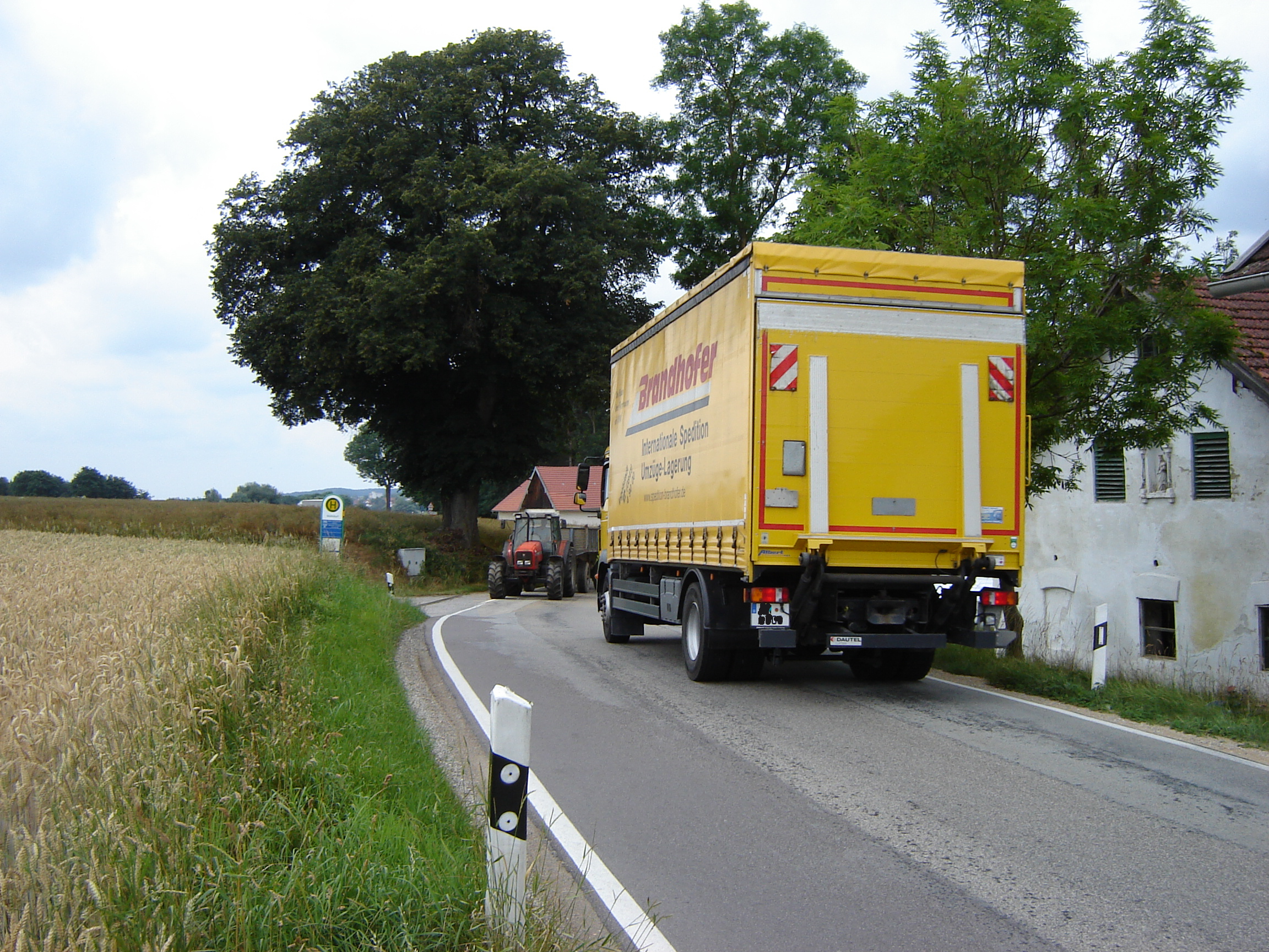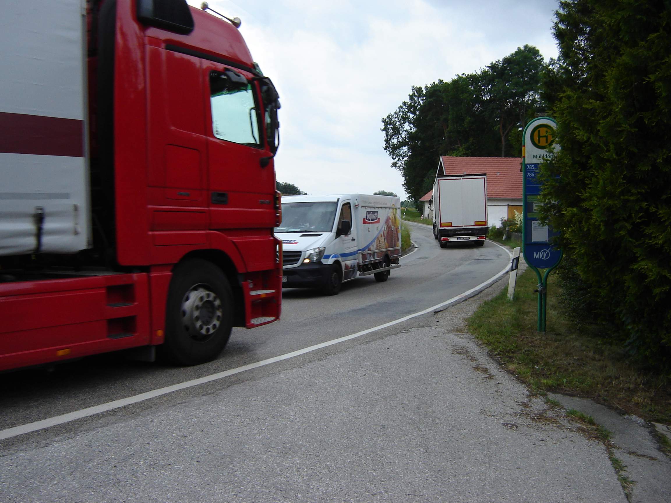 Die LKWs begegnen sich bei Mühldorf in drangvoller Enge und müssen manchmal sogar stehen bleiben, um vorsichtig aneinander vorbeizukommen.