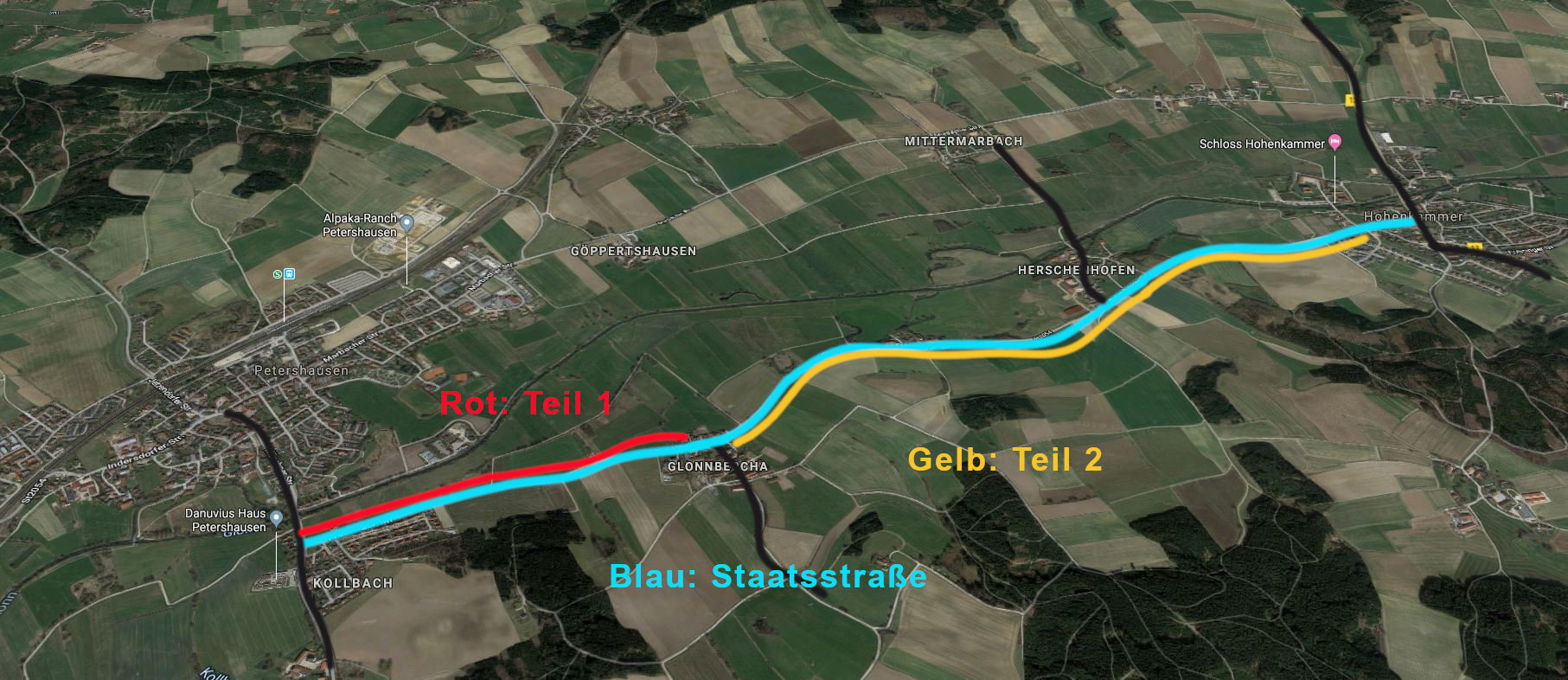 Da der Erwerb der Flächen problematisch war, bitte wir jetzt um eine Neuplanung auf der Glonnseite (Nordseite) der Staatsstraße zwischen Petershausen und Glonnbercha. Das wäre Teil 1. Der weitere Verlauf (Teil 2) könnte dann südlich der Staatsstraße geplant werden bis Hohenkammer, wo er auf bereits vorhandene Fahrradwege stoßen würde.
